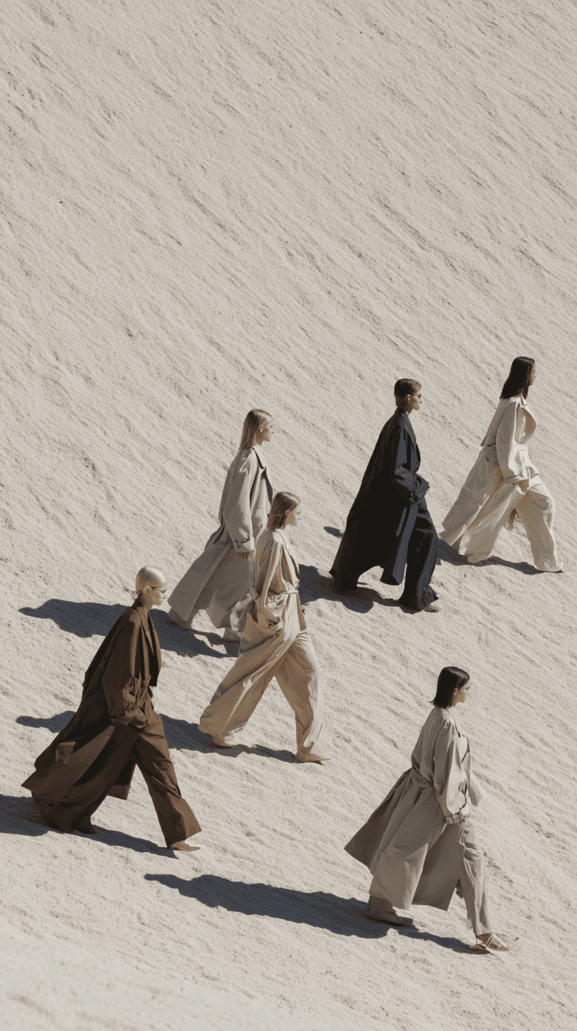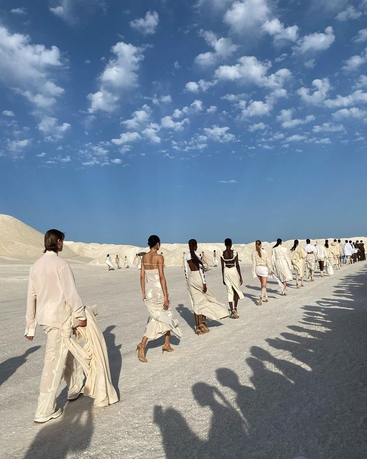Models walk in a line toward the camera across the dunes. Their calm expressions and slow pace create a quiet, powerful presence.