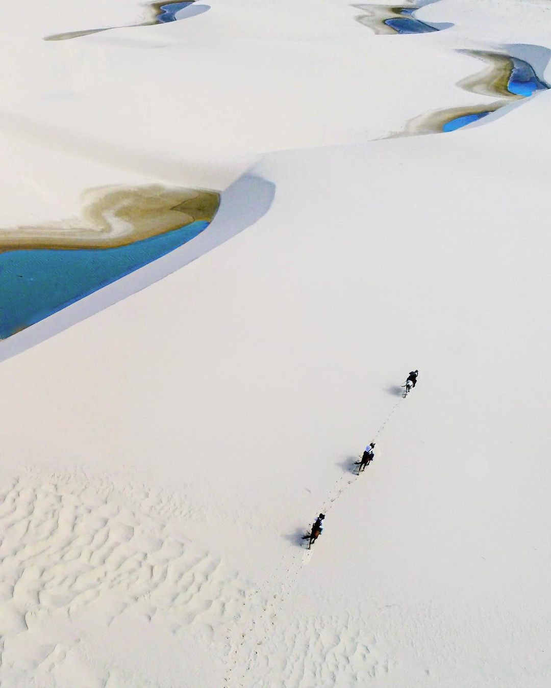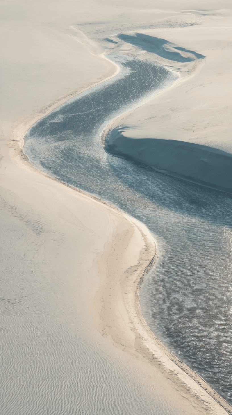 A wide drone shot shows endless white sand dunes and calm water lines.